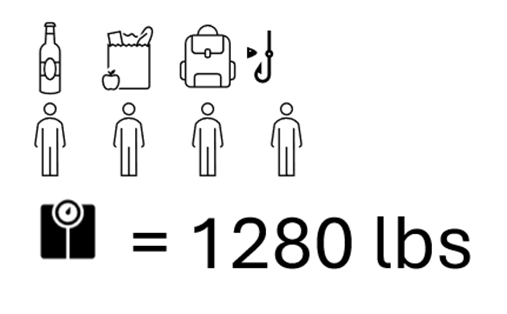 Example – if you weigh up to 220 lbs, you can bring 100 lbs, if you weigh more than 220, simply deduct from your cargo weight. You can average the weights out for the group. 320 lbs x 4 = 1280 lbs total for a group of 4